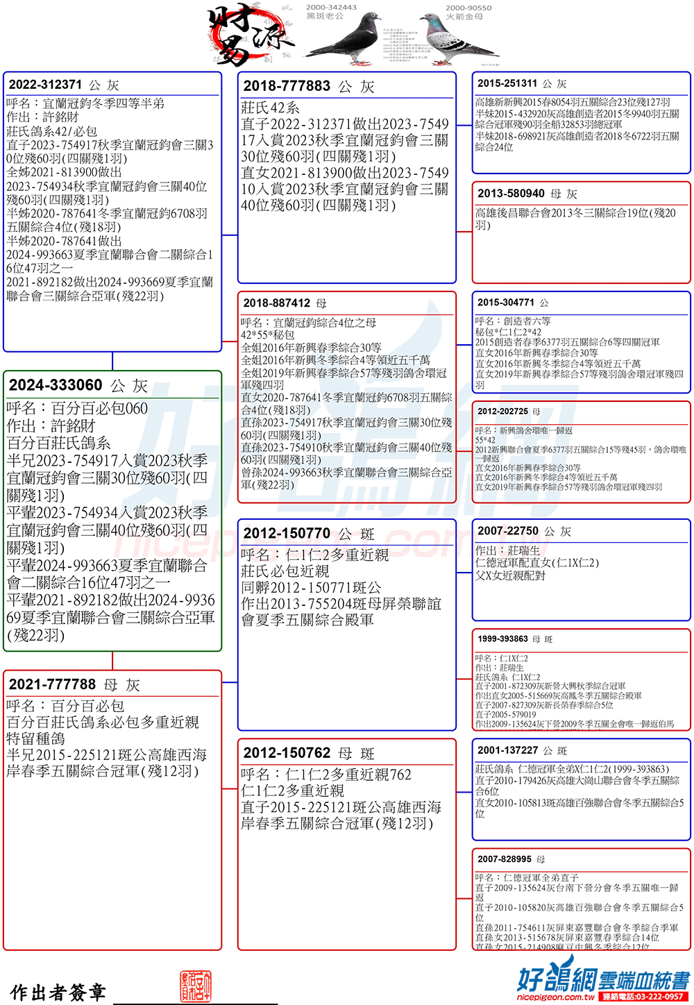 2025年夏季宜蘭聯合會二關綜合8位,環號25-137047灰♂,其父鴿24-993616斑♂,本身入賞夏季三關綜合7位(群益冠軍家族X小火箭三冠家族),母親24-333022,血統為夏季三關綜合亞軍全妹(雙伯馬家族X哈利近親)所作出,許銘財又一次以實戰成績印證了優質血統一脈相承的可貴。