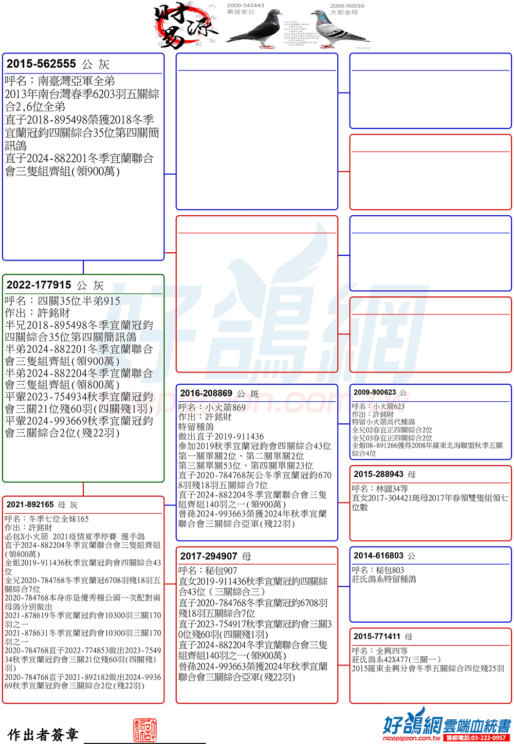 2025年夏季宜蘭聯合會二關綜合8位,環號25-137047灰♂,其父鴿24-993616斑♂,本身入賞夏季三關綜合7位(群益冠軍家族X小火箭三冠家族),母親24-333022,血統為夏季三關綜合亞軍全妹(雙伯馬家族X哈利近親)所作出,許銘財又一次以實戰成績印證了優質血統一脈相承的可貴。