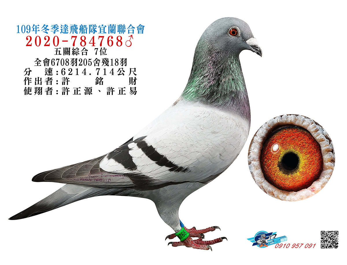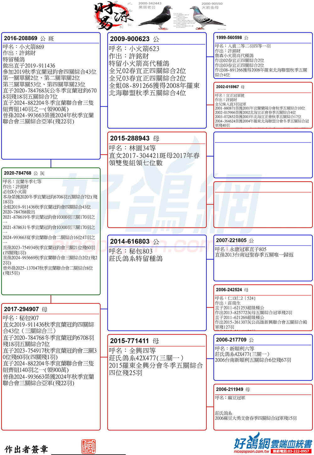 2025年夏季宜蘭聯合會二關綜合8位,環號25-137047灰♂,其父鴿24-993616斑♂,本身入賞夏季三關綜合7位(群益冠軍家族X小火箭三冠家族),母親24-333022,血統為夏季三關綜合亞軍全妹(雙伯馬家族X哈利近親)所作出,許銘財又一次以實戰成績印證了優質血統一脈相承的可貴。