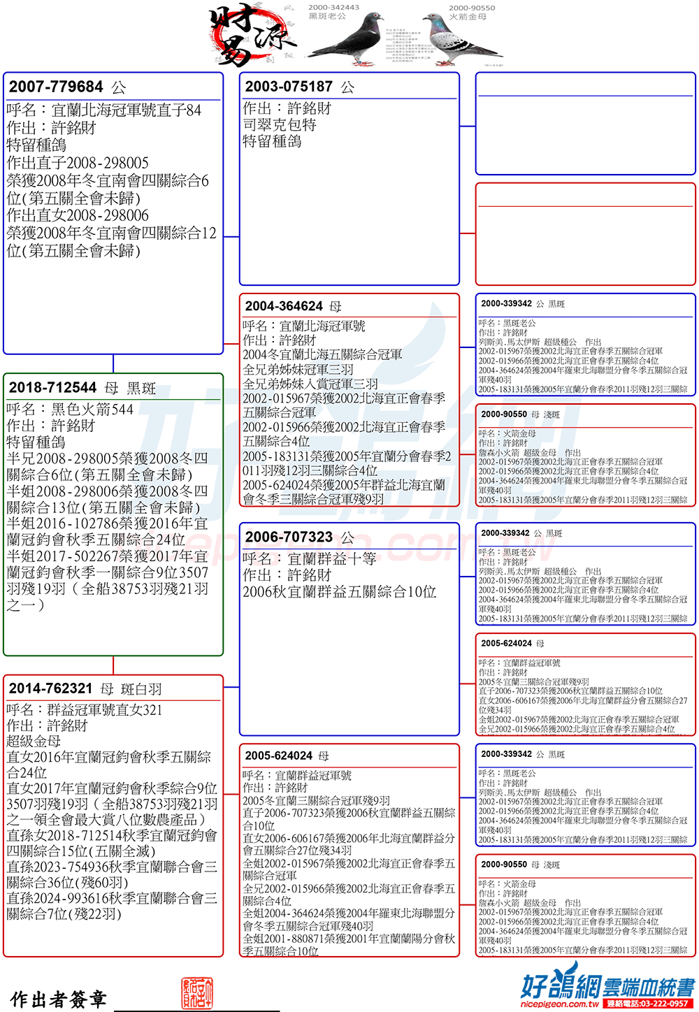 2025年夏季宜蘭聯合會二關綜合8位,環號25-137047灰♂,其父鴿24-993616斑♂,本身入賞夏季三關綜合7位(群益冠軍家族X小火箭三冠家族),母親24-333022,血統為夏季三關綜合亞軍全妹(雙伯馬家族X哈利近親)所作出,許銘財又一次以實戰成績印證了優質血統一脈相承的可貴。