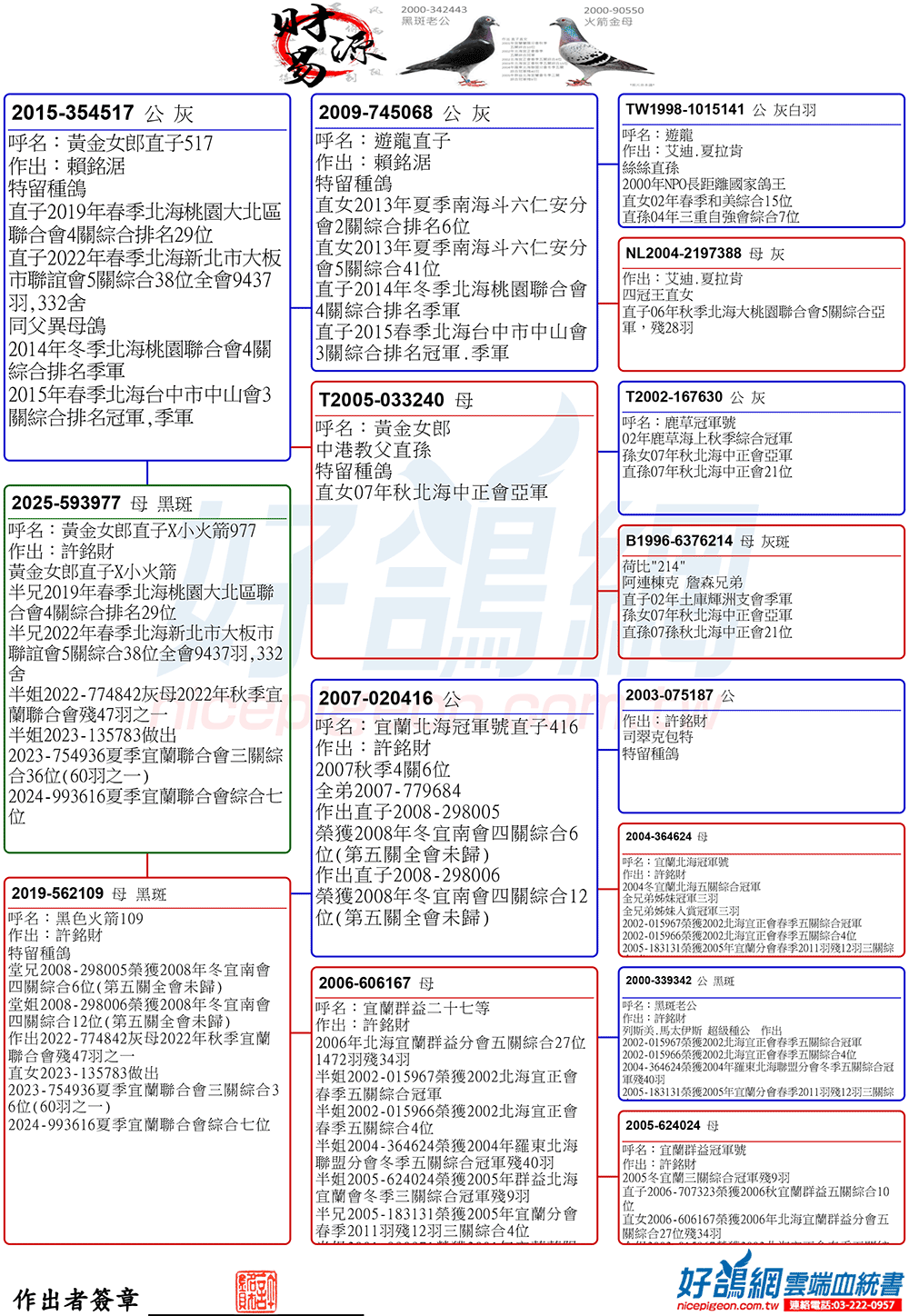 2025年夏季宜蘭聯合會二關綜合8位,環號25-137047灰♂,其父鴿24-993616斑♂,本身入賞夏季三關綜合7位(群益冠軍家族X小火箭三冠家族),母親24-333022,血統為夏季三關綜合亞軍全妹(雙伯馬家族X哈利近親)所作出,許銘財又一次以實戰成績印證了優質血統一脈相承的可貴。