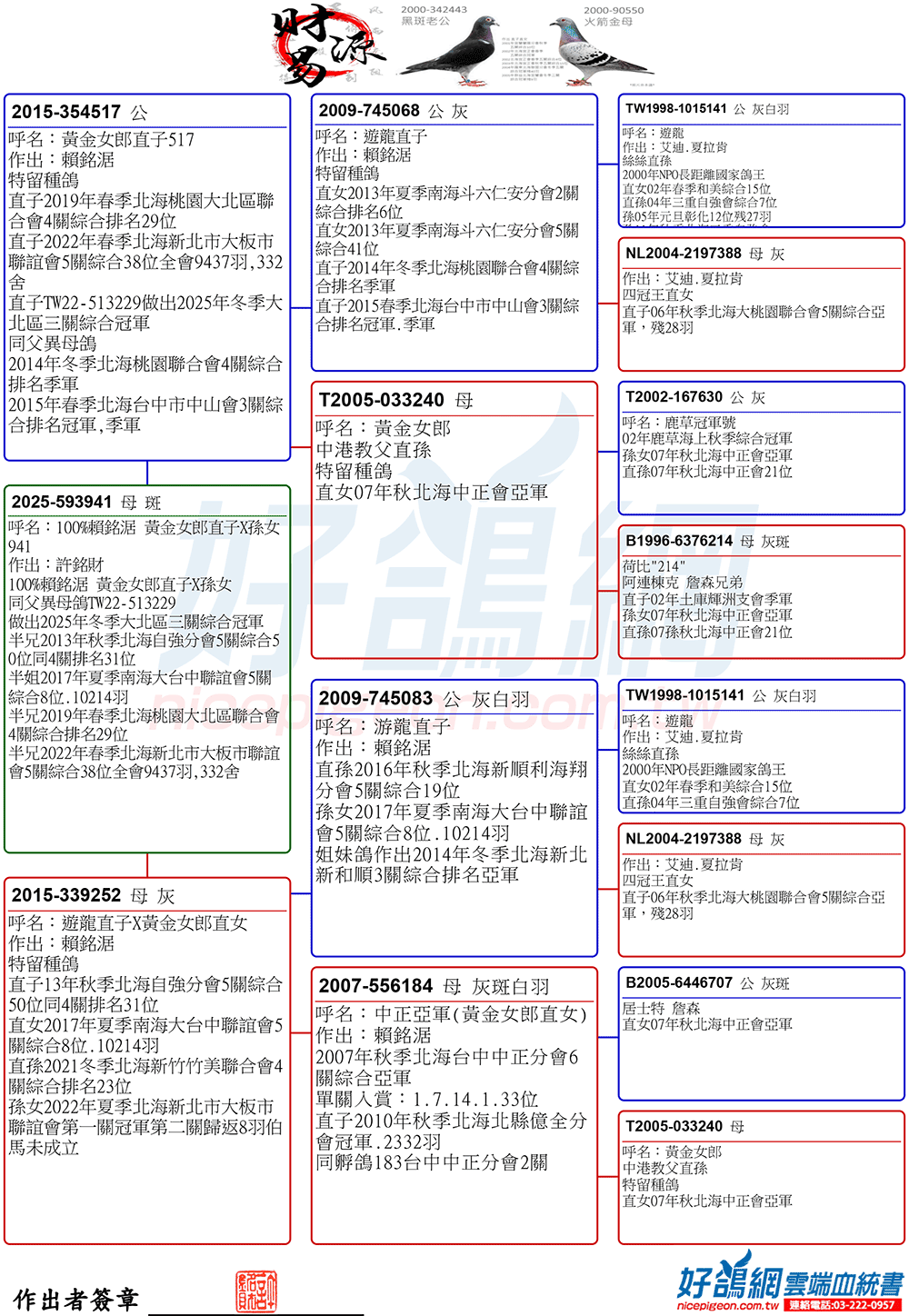 100%賴銘涺;黃金女郎(子X孫女)、遊龍(孫X孫女)近親家族;同父異母鴿作出2025冬季大北區三關綜合冠軍,同母異父鴿大台中五關綜合8位