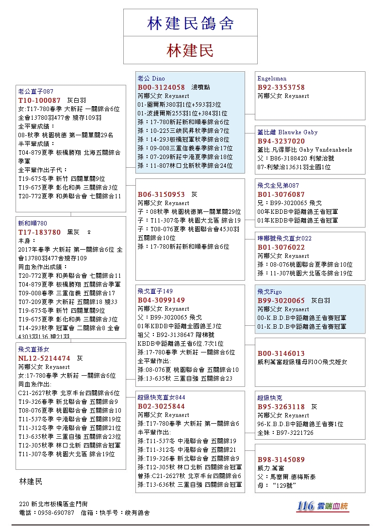 以“快客B08-3180121花頭白羽♂為核心,其血統出自芮娜父女本舍作出,父鴿046為中距離鴿王冠軍“超級快客”X克莉絲所作出,其直子入賞新和順夏季綜合34位、中港冬季綜合19位、直女入賞三峽民昇秋季綜合3位、林口北新秋季綜合18位,目前已發揮至第五代,快客下代在該舍可說是耐力與速度兼具的奪標主力,快客在9歲高齡還作出伯馬子代,其優秀遺傳力可見一斑。