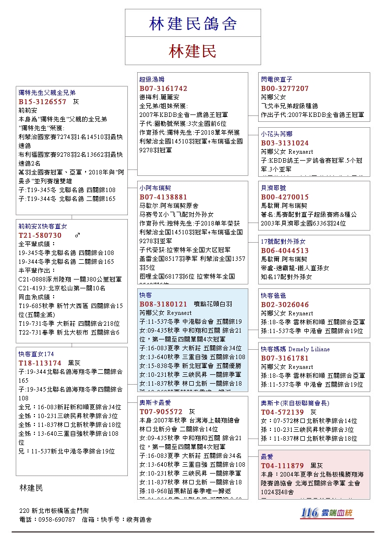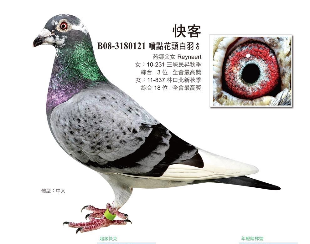 以“快客B08-3180121花頭白羽♂為核心,其血統出自芮娜父女本舍作出,父鴿046為中距離鴿王冠軍“超級快客”X克莉絲所作出,其直子入賞新和順夏季綜合34位、中港冬季綜合19位、直女入賞三峽民昇秋季綜合3位、林口北新秋季綜合18位,目前已發揮至第五代,快客下代在該舍可說是耐力與速度兼具的奪標主力,快客在9歲高齡還作出伯馬子代,其優秀遺傳力可見一斑。