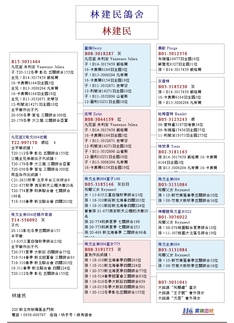 以B07-6235207灰♂為基礎,這位居住在比利時阿連棟克的老將,是一位在幼鴿速度賽的佼佼者,生涯中屢獲比利時KBDB速度鴿王冠軍榮銜的名將,林建民是台灣鴿界最早引進雷尼馬頓鴿系的先驅者之一,此系在燠熱低分速的賽事中常有