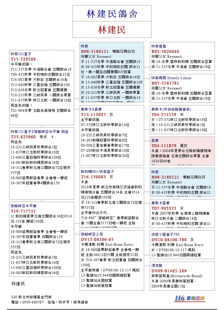 以“快客B08-3180121花頭白羽♂為核心,其血統出自芮娜父女本舍作出,父鴿046為中距離鴿王冠軍“超級快客”X克莉絲所作出,其直子入賞新和順夏季綜合34位、中港冬季綜合19位、直女入賞三峽民昇秋季綜合3位、林口北新秋季綜合18位,目前已發揮至第五代,快客下代在該舍可說是耐力與速度兼具的奪標主力,快客在9歲高齡還作出伯馬子代,其優秀遺傳力可見一斑。