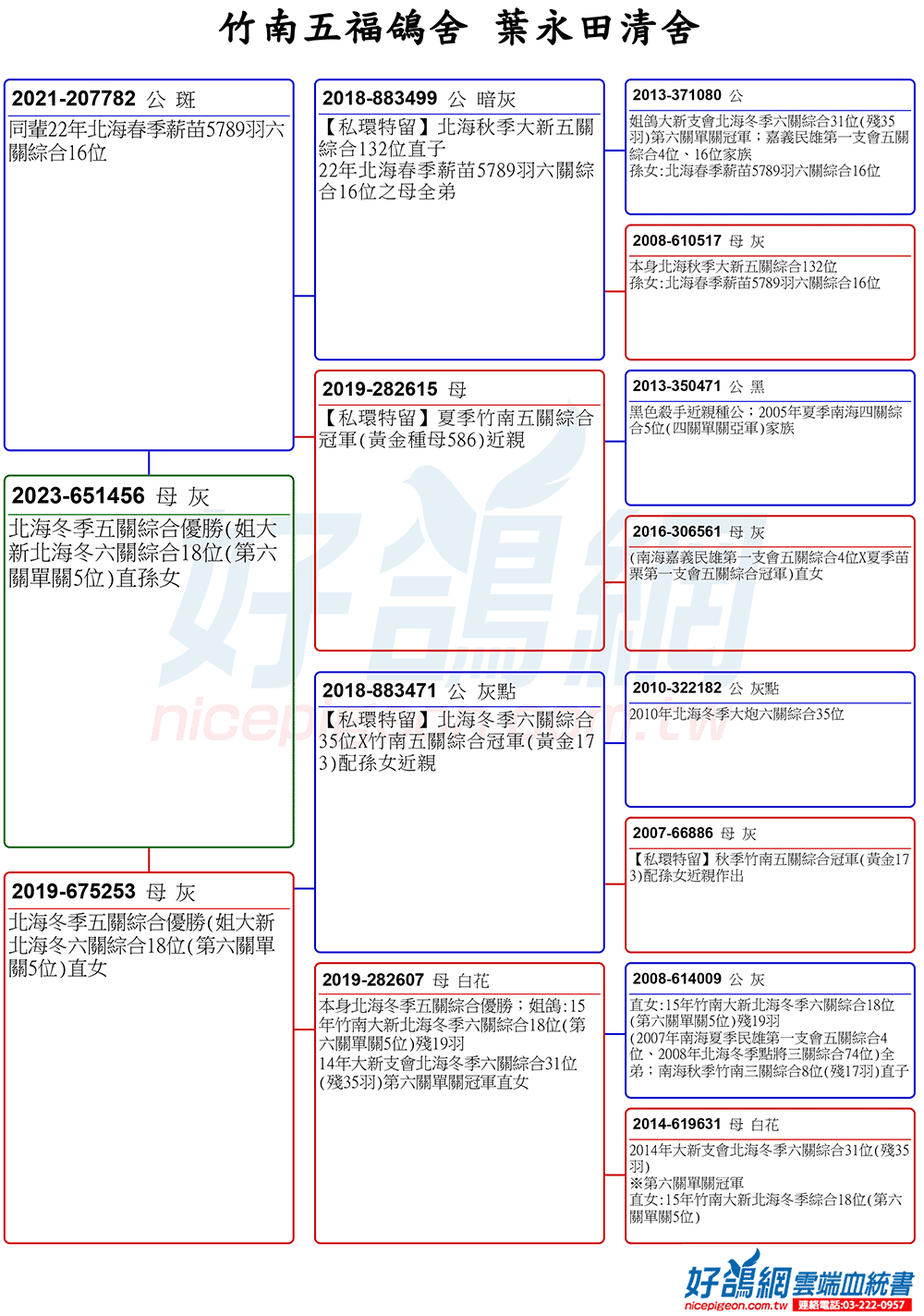 葉董早期以詹森、羅森斯系統為核心血統,重視速度、穩定性。回顧參賽南海賽事時期,對賽程節奏與氣候判斷有獨到見解,實績表現亦相當亮眼。隨著賽事型態與氣候條件逐年轉變,進入北海賽事,葉董並未墨守成規,而是順勢調整育種方向,後期逐步導入黑色殺手、梅斯一號李巴克鴿系,強化鴿群在逆風、長距離與惡劣氣候下歸返能力,展現極高的適應性與實戰價值。