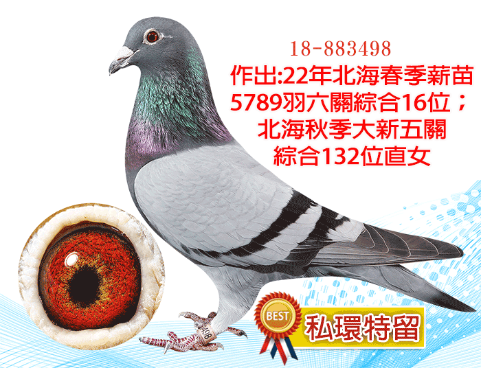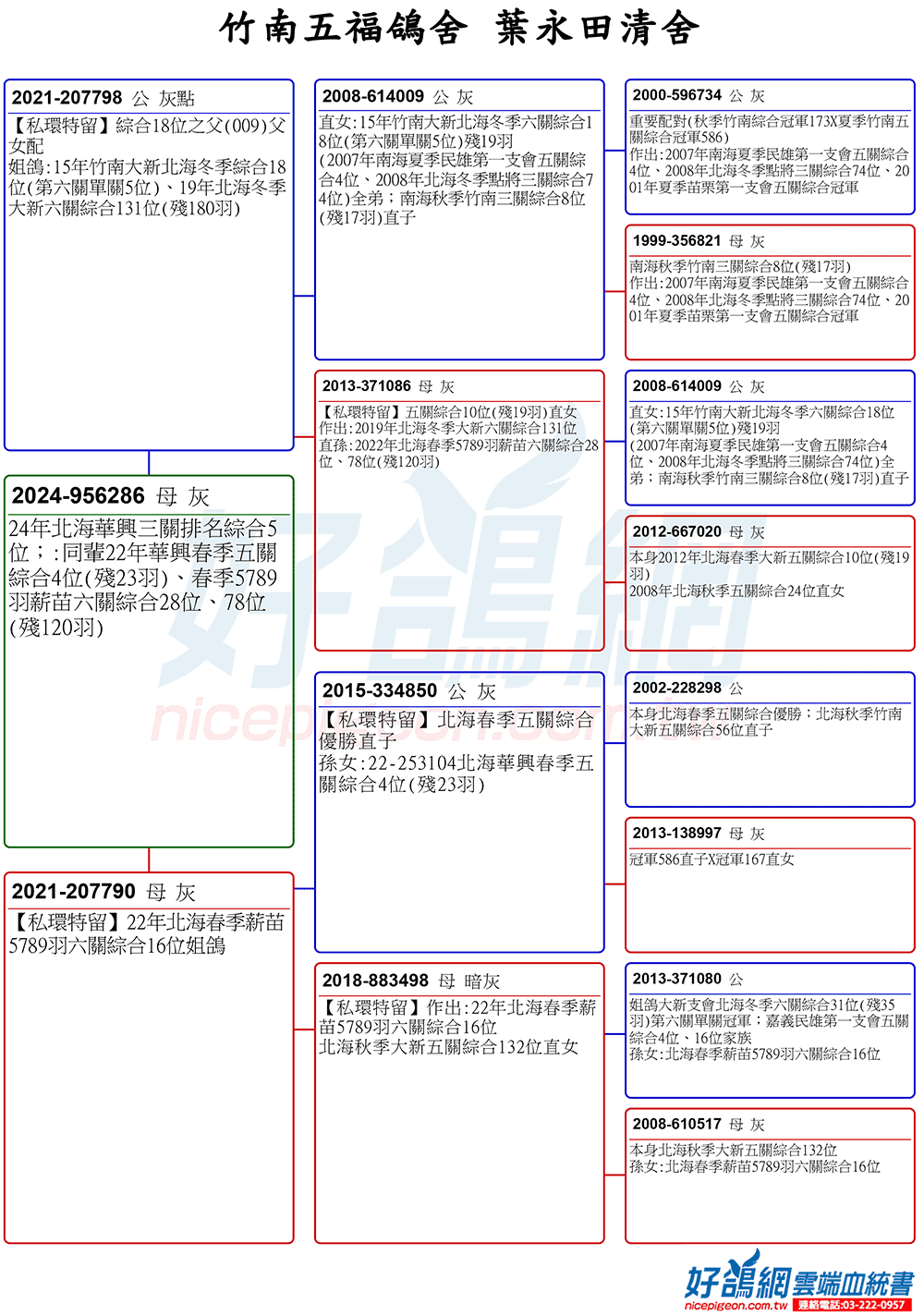 24年北海華興三關排名綜合5位;:同輩22年華興春季五關綜合4位(殘23羽)、春季5789羽薪苗六關綜合28位、78位(殘120羽)