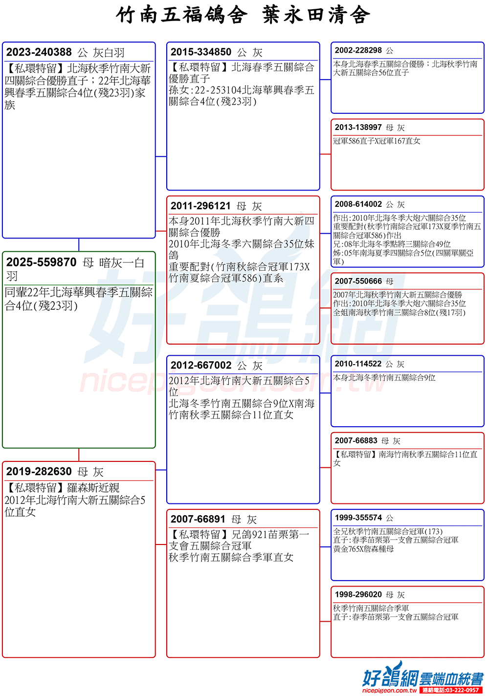 葉董早期以詹森、羅森斯系統為核心血統,重視速度、穩定性。回顧參賽南海賽事時期,對賽程節奏與氣候判斷有獨到見解,實績表現亦相當亮眼。隨著賽事型態與氣候條件逐年轉變,進入北海賽事,葉董並未墨守成規,而是順勢調整育種方向,後期逐步導入黑色殺手、梅斯一號李巴克鴿系,強化鴿群在逆風、長距離與惡劣氣候下歸返能力,展現極高的適應性與實戰價值。