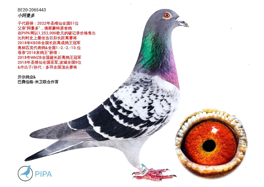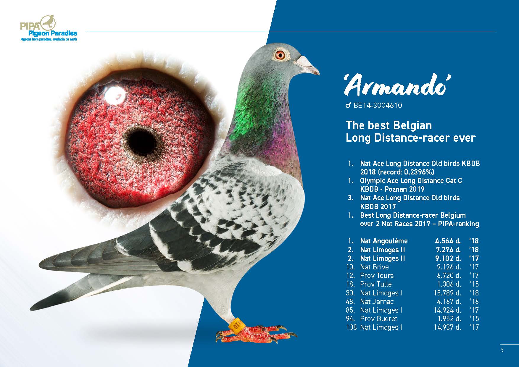 曾經轟動鴿壇的第一羽超過百萬歐元的創天價名鴿〝阿曼多〞,環號B14-3004610斑♂,本身以打破百年比利時賽鴿史,長距離鴿王冠軍最低係數,入賞2018年KBDB長距離鴿王冠軍王座, 加上2017年入賞KBDB長距離鴿王全國3位,相信〝阿曼多〞連續兩年勇奪長距離鴿王全國冠軍及3位,這項輝煌紀錄是很難被超越...
