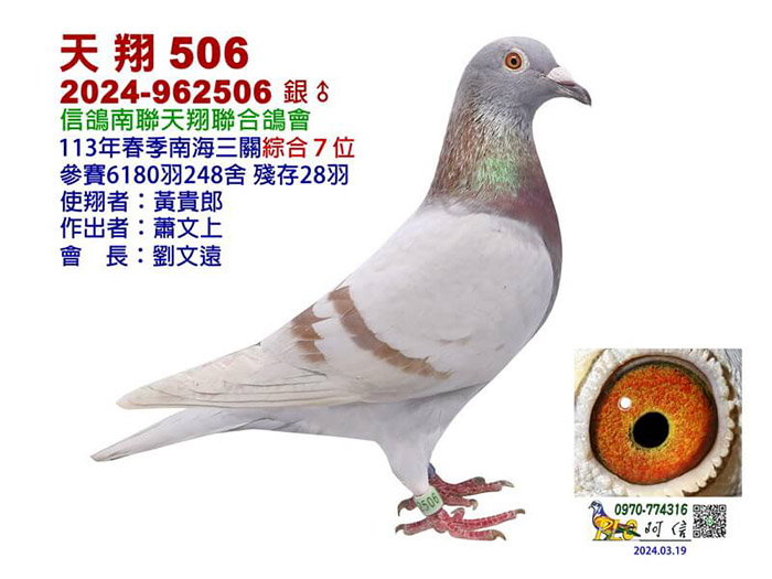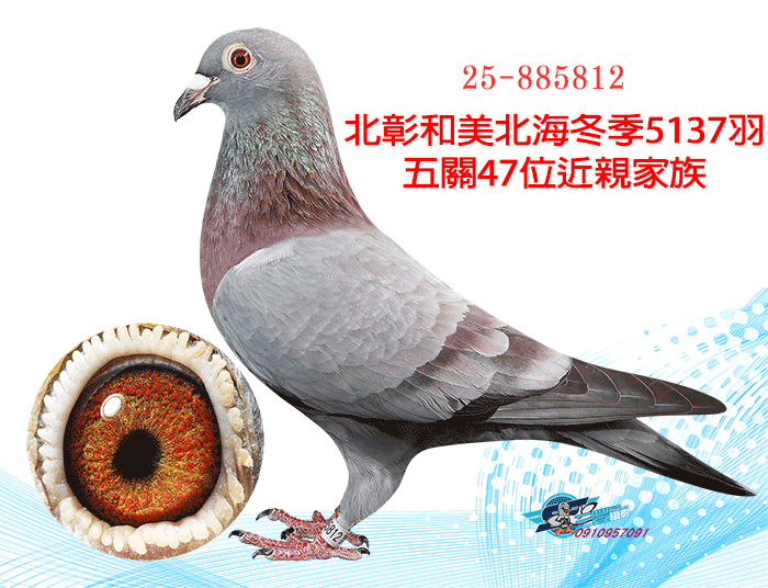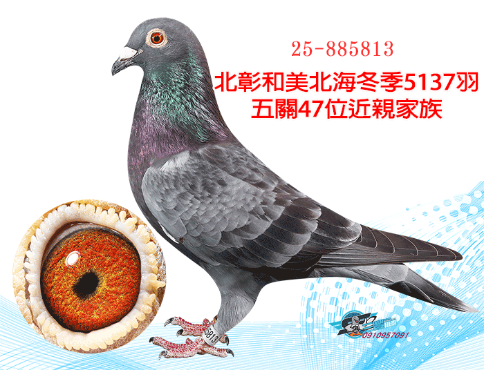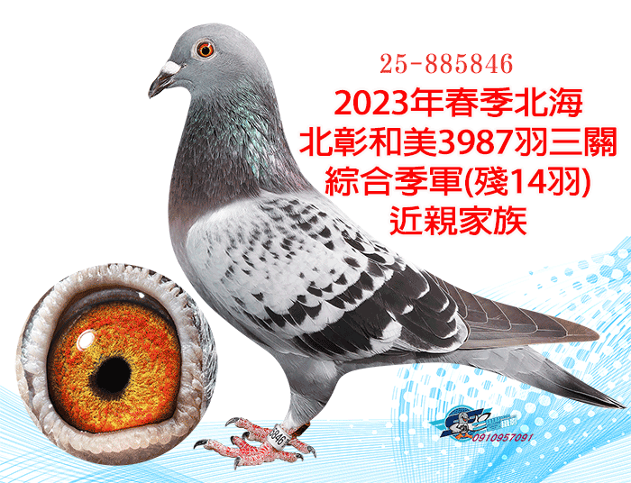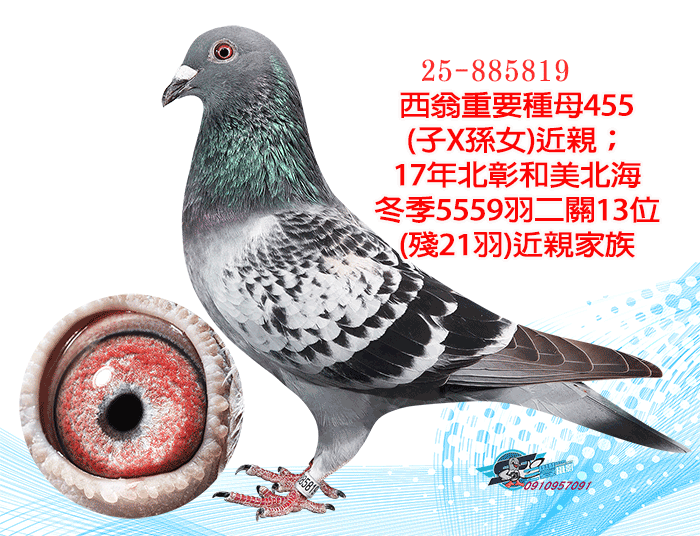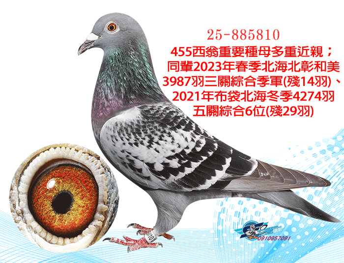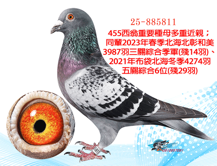 455西翁重要種母多重近親;同輩2023年春季北海北彰和美3987羽三關綜合季軍(殘14羽)、2021年布袋北海冬季4274羽五關綜合6位(殘29羽)