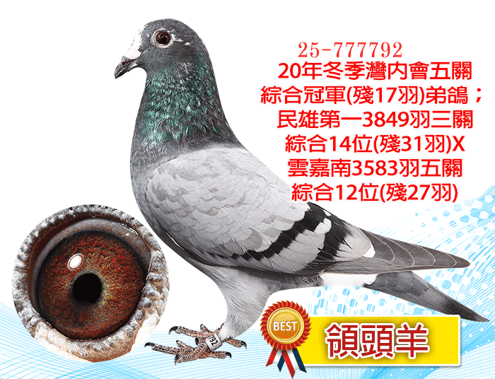 【領頭羊】20年冬季灣內會五關綜合冠軍(殘17羽)弟鴿;民雄第一3849羽三關綜合14位(殘31羽)X雲嘉南3583羽五關綜合12位(殘27羽)