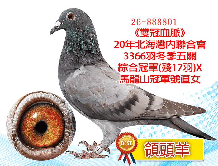 【領頭羊】《雙冠血脈》20年北海灣內聯合會3366羽冬季五關綜合冠軍(殘17羽)X馬龍山冠軍號直女