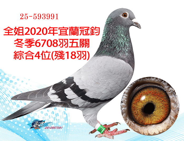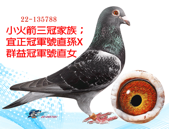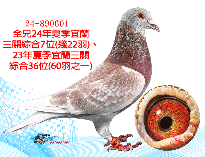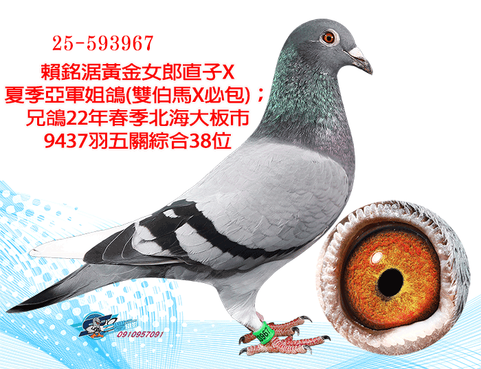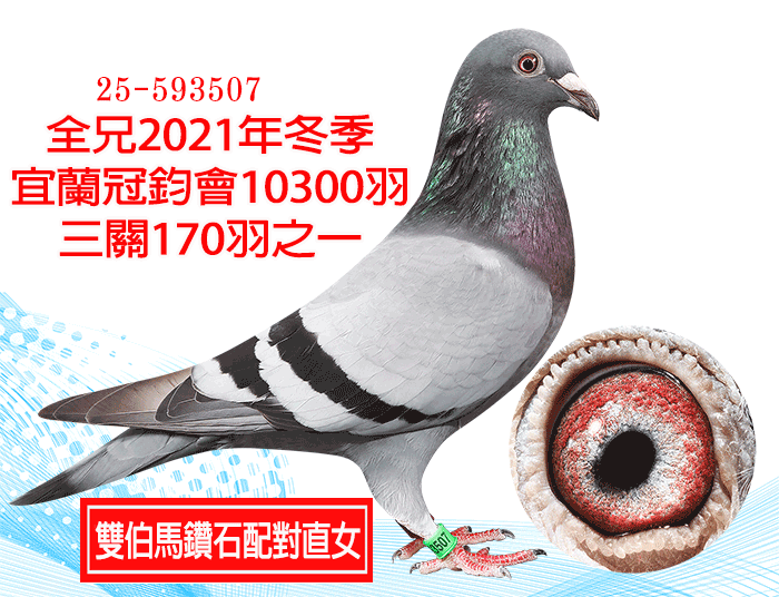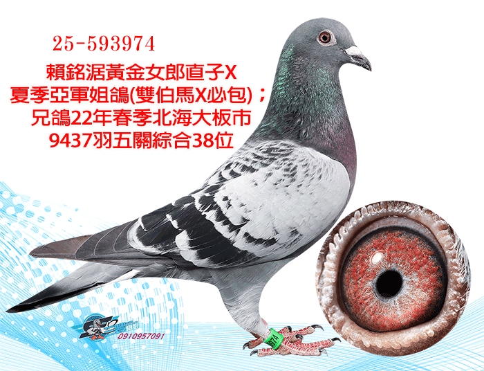 賴銘涺黃金女郎直子X夏季亞軍姐鴿(雙伯馬X必包);兄鴿22年春季北海大板市9437羽五關綜合38位;兄鴿作出2025冬季大北區三關綜合冠軍