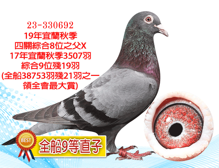 【全船9等直子】19年宜蘭秋季四關綜合8位之父X17年宜蘭秋季3507羽綜合9位殘19羽(全船38753羽殘21羽之一領全會最大賞)