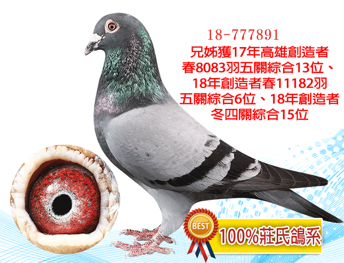 【100%莊氏鴿系】兄姊獲17年高雄創造者春8083羽五關綜合13位、18年創造者春11182羽五關綜合6位、18年創造者冬四關綜合15位
