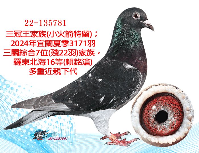 三冠王家族(小火箭特留);2024年宜蘭夏季3171羽三關綜合7位(殘22羽)家族,羅東北海16等(賴銘滄)多重近親下代