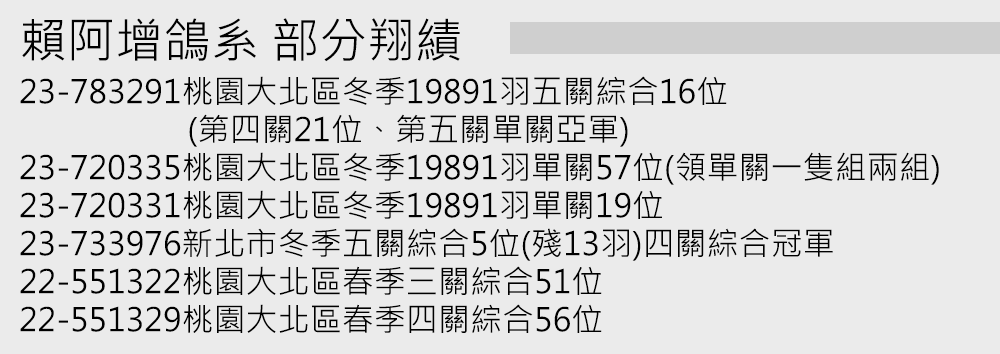 三峽民昇冬季三關綜合21位直子;大北區五關115位、民昇冬季單關9位弟鴿